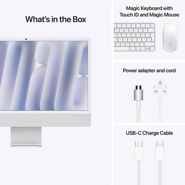 Apple iMac مقاس 24 بوصة M4 وحدة معالجة مركزية 10 نواة، وذاكرة وصول عشوائي 16 جيجابايت، ومحرك أقراص SSD سعة 512 جيجابايت، ووحدة معالجة رسومات 10 نواة، وشاشة Retina 4.5K، ونظام التشغيل MacOS Sequoia – فضي (MWUV3AB/A)